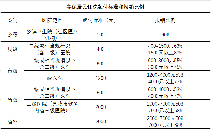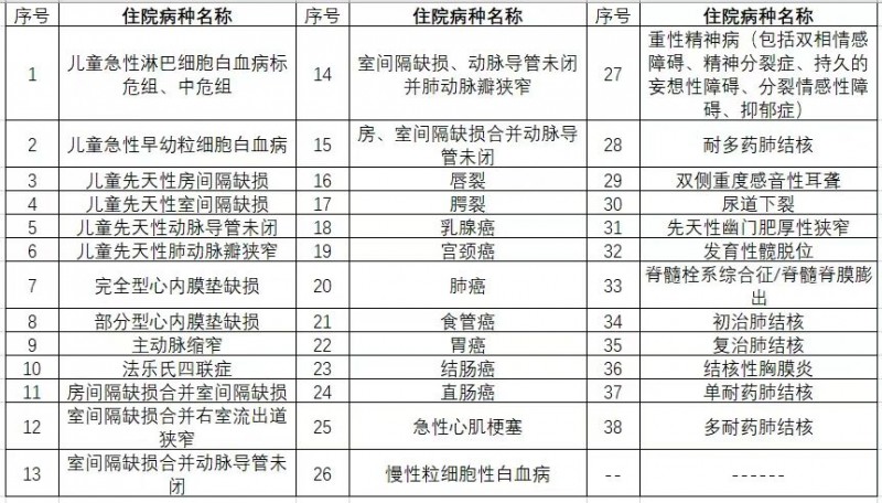 (四)重特大疾病住院医疗待遇城乡居民如果患以下38种重特大疾病住院,可以按规定享受我省城乡居民重特大疾病医疗保障待遇,即在指定的医疗机构住院就医,按限价标准报销,不设起付线;其中住院病种县级、市级、省级医疗机构住院的政策范围内医疗费用报销比例分别是 80%、70%、65%,具体病种如下: