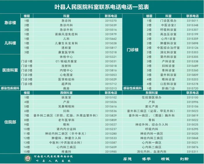 说明:关于叶县人民医院各科室联系电话一览表的信息仅供参考。