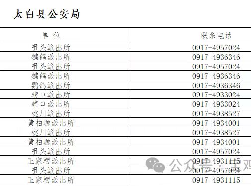 为切实践行 “我为群众办实事”便民利民服务措施,太白县各派出所户政窗口为了更好地为市民朋友们提供办证服务,现将太白县各派出所户政窗口办理业务预约咨询电话公布如下,期待为您服务。