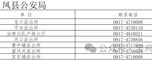 为切实践行 “我为群众办实事”便民利民服务措施,凤县各派出所户政窗口为了更好地为市民朋友们提供办证服务,现将凤县各派出所户政窗口办理业务预约咨询电话公布如下,期待为您服务。