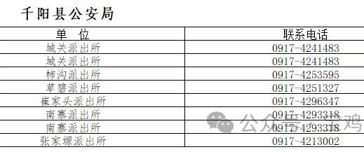 说明:关于千阳县各派出所户政窗口办理业务预约咨询电话信息作出免责声明,此信息图文仅供参考,小编不承担任何法律责任。此信息来源于有关机构的公开内容,在此经过整理并转载,唯一的目的是通过互联网传播便民惠民信息。由于时间等原因,难免使信息发生变更,此信息如有侵权,或者差错,请联系删除,直接联系便民信息平台秋果黄页网客服电话(187-8199-3958微信同号),一定会及时删除和修正。