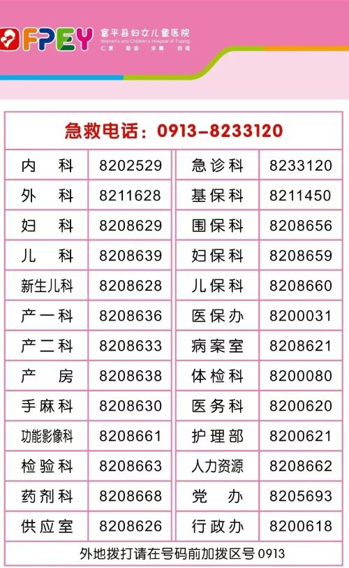 说明:关于富平县妇幼保健院各医疗服务科室电话的信息仅供参考。