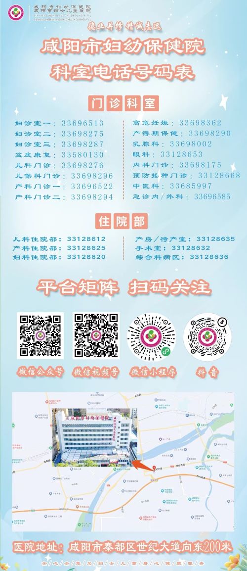 咸阳市妇幼保健院门诊科室和住院部科室电话号码表: