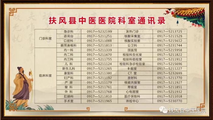 说明:关于扶风县中医医院医疗科室通讯录的信息仅供参考。