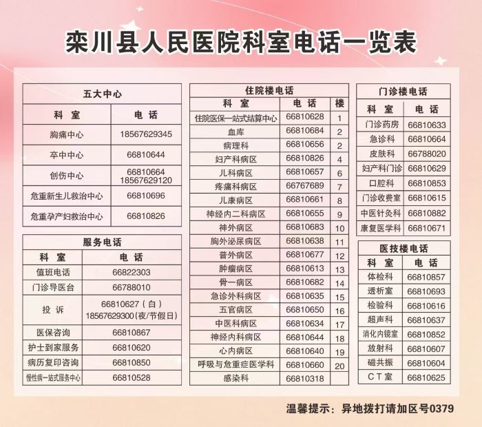 说明:关于栾川县人民医院各科室电话一览表的信息仅供参考。