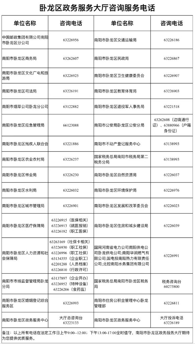 为了进一步提升政务服务质量,优化服务环境,方便企业、群众咨询政务服务各事项办理情况,现将南阳市卧龙区政务服务中心大厅进驻机构各窗口业务咨询电话公示如下: