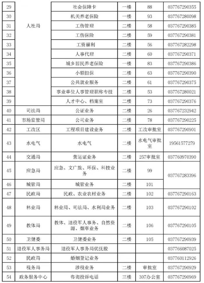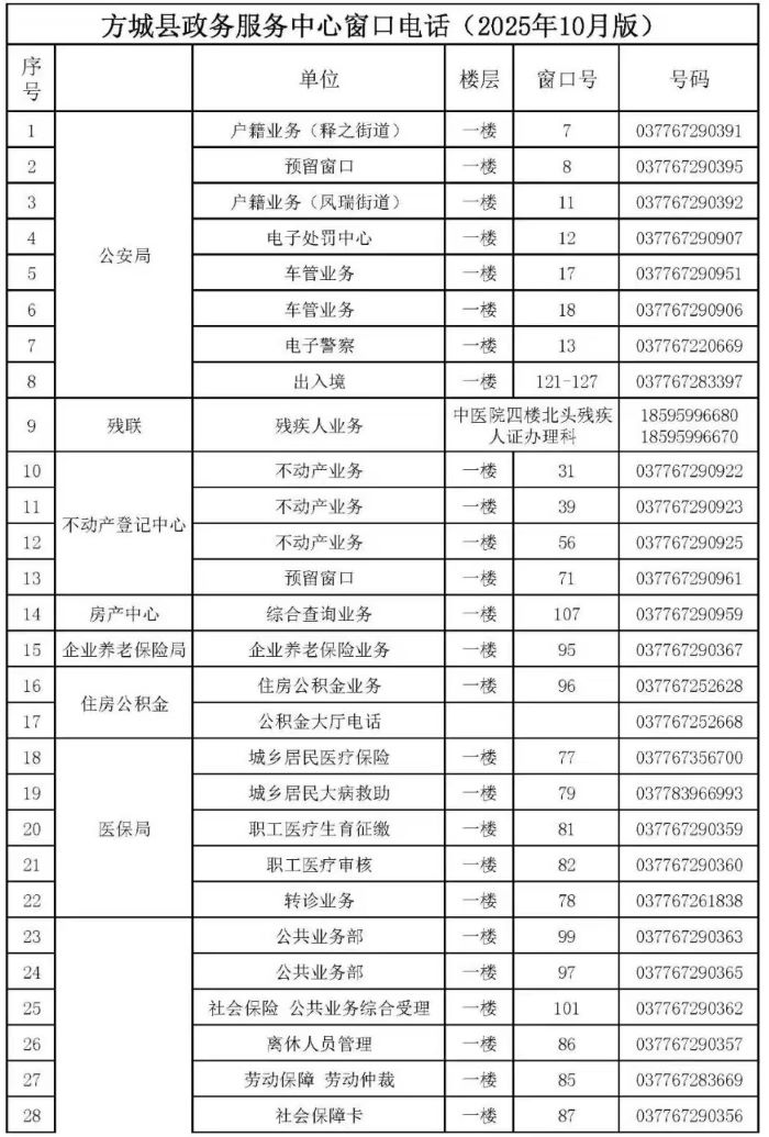 为了进一步提升政务服务质量,优化服务环境,方便企业、群众咨询政务服务各事项办理情况,现将方城县政务服务中心大厅进驻机构各窗口业务咨询电话公示如下: