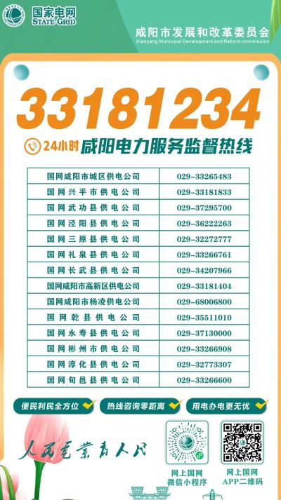 咸阳市全市各县(区、市)电力服务监督热线电话:
