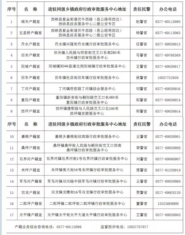 为推进政务服务向基层延伸,打通服务群众“最后一公里”,当前,西峡县17个乡镇派出所户籍室已全部顺利进驻同级乡镇政府行政审批服务中心,群众可在家门口就近办理户籍业务和交管高频业务,切实做到了“跑一次腿,办多项业务”。为将便民利民政策落到实处,方便群众咨询、办理业务,以下是户籍室进驻同级乡镇政府行政审批服务中心地址、办公电话,如有问题,可及时拨打相应电话,“一键”解决您的办证需求。