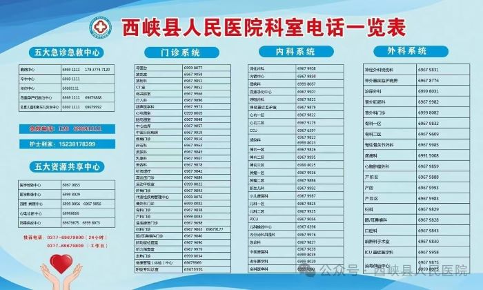 说明:关于西峡县人民医院各个医疗科室电话一览表的信息仅供参考。