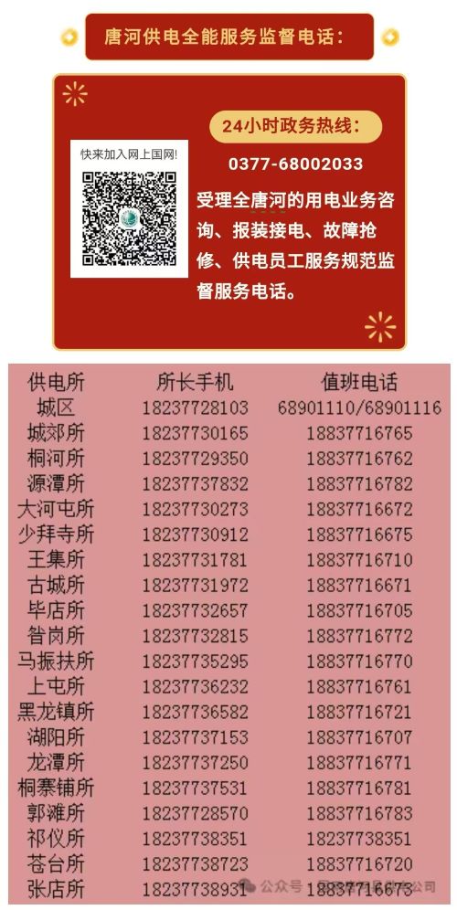 说明:关于唐河县供电公司24小时政务热线和各供电所值班电话的信息仅供参考。