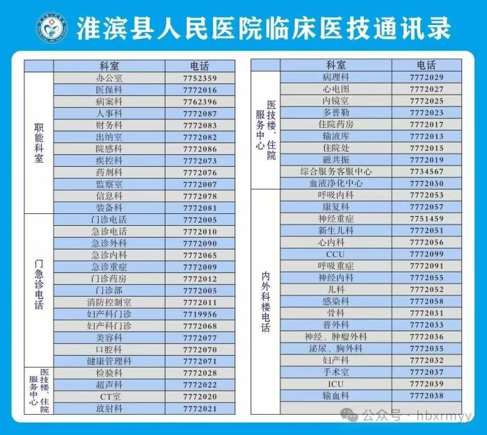 说明:关于淮滨县人民医院临床医技科室通讯录的信息仅供参考。