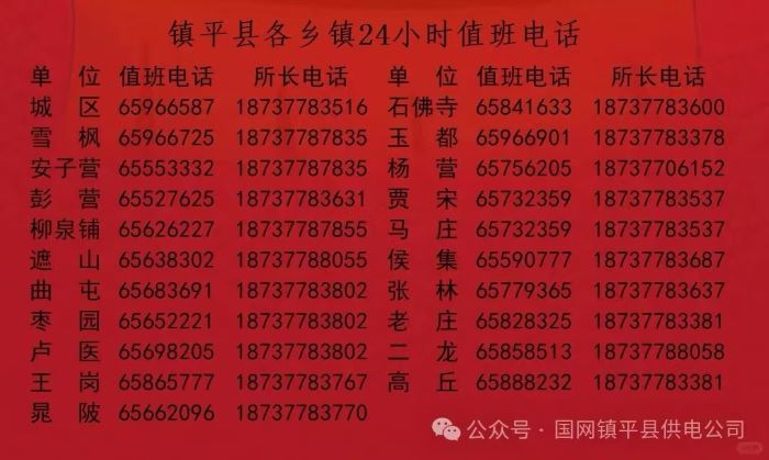 您的诉求我来办,24小时不间断。人民电业为人民,用心服务是关键。镇平县供电公司提示,您的任何用电疑问,均可致电供电服务电话。极速响应,用电无忧!镇平县供电公司各乡镇24小时值班电话如下: