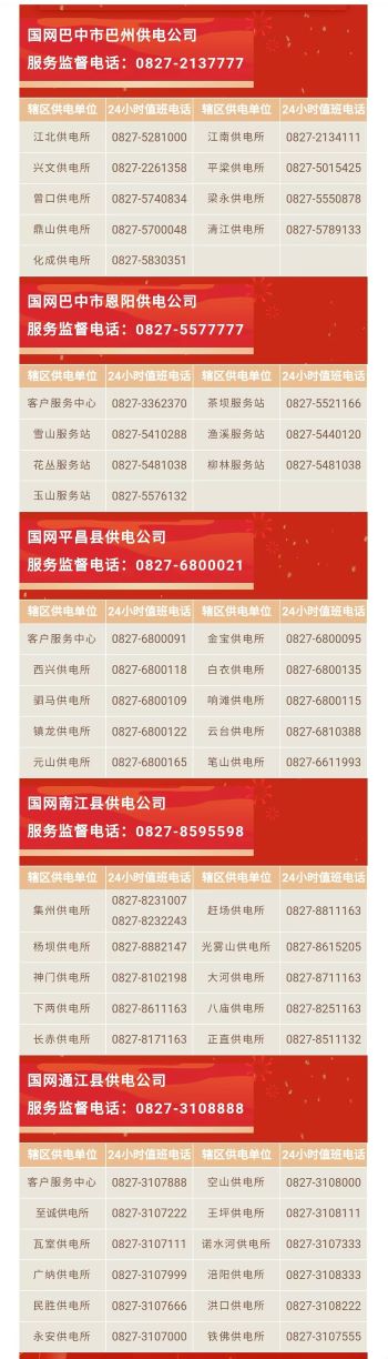 您的诉求我来办,24小时不间断。人民电业为人民,用心服务是关键。巴中市各供电公司提示,您的任何用电疑问,均可致电供电服务监督电话。极速响应,用电无忧!巴中市全市供电公司各供电所24小时值班电话如下: