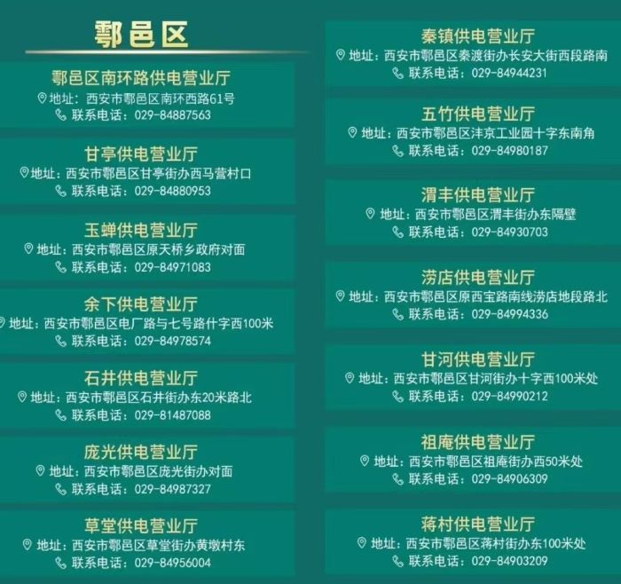 说明:关于国网西安市鄠邑区供电公司各供电营业厅地址和联系电话的信息仅供参考。