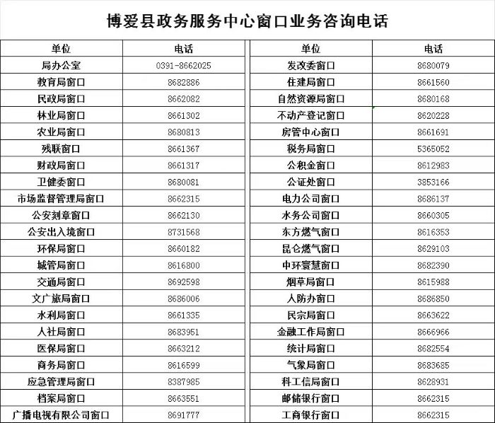 博爱县政务服务中心进驻机构办事窗口业务咨询电话:为纵深推进“一网通办”前提下“最多跑一次”改革,提升政务服务中心便民服务效能,现将各窗口咨询电话予以公布,欢迎广大群众来电咨询。