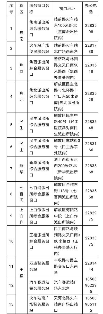 上白作派出所综合服务窗口地址:解放区河阳路中段(上白作派出所院内),联系电话:0391-228297510