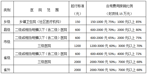 (二)住院待遇:参保居民在定点医疗机构发生的政策范围内住院医疗费用,起付标准以下由个人支付;起付标准以上由住院统筹基金按比例支付,额度不超过住院统筹基金年度最高支付限额。参保居民住院医保基金起付标准和报销比例如下: