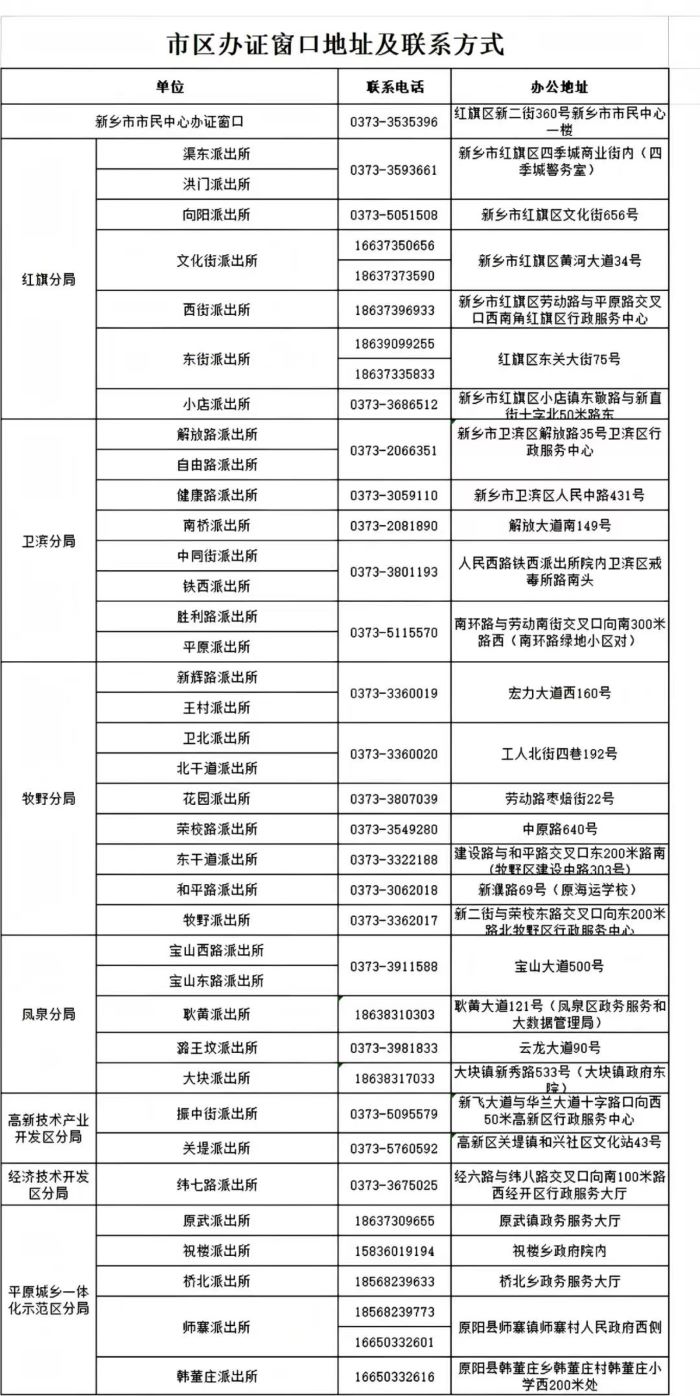 新乡市市区各派出所身份证办证窗口地址及联系电话信息表如下: