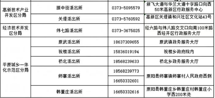 新乡市高新技术产业开发区各派出所身份证办证窗口地址和联系电话。新乡市经济技术产业开发区各派出所身份证办证窗口地址和联系电话。新乡市平原城乡一体化示范区各派出所身份证办证窗口地址和联系电话。