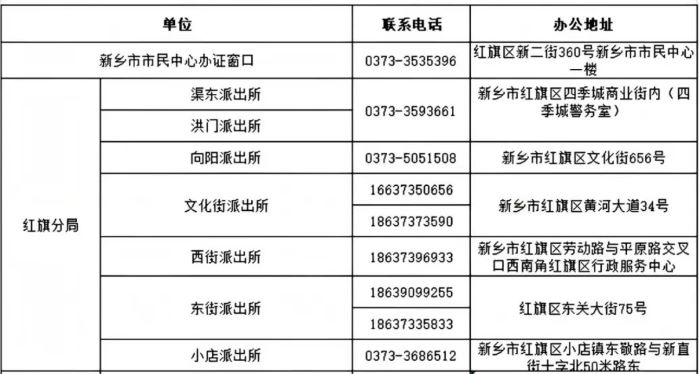 新乡市红旗区各派出所综合窗口身份证办证地址和联系电话信息表如下: