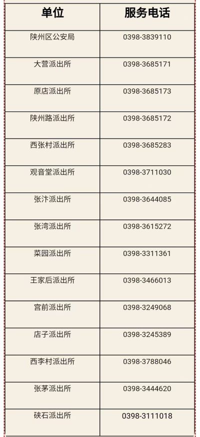 说明:关于三门峡市陕州区各派出所户籍窗口身份证办证咨询预约电话信息作出免责声明,此信息图文仅供参考,小编不承担任何法律责任。此信息来源于有关机构的公开内容,在此经过整理并转载,唯一的目的是通过互联网传播便民惠民信息。由于时间等原因,难免使信息发生变更,此信息如有侵权,或者差错,请联系删除,直接联系便民信息平台秋果黄页网客服电话(187-8199-3958微信同号),一定会及时删除和修正。