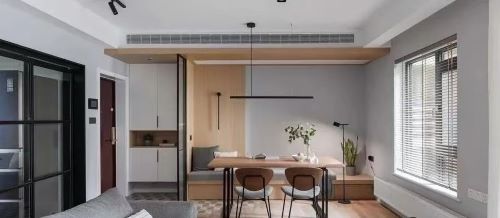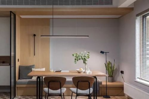 餐厅置入卡座,美观实用还节省空间。木色的卡座、灰色的坐垫,搭配黑色线性照明灯,简约高级范。餐桌椅子延续了灰黑原木调性,保持了格调上的高度统一。