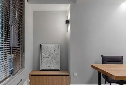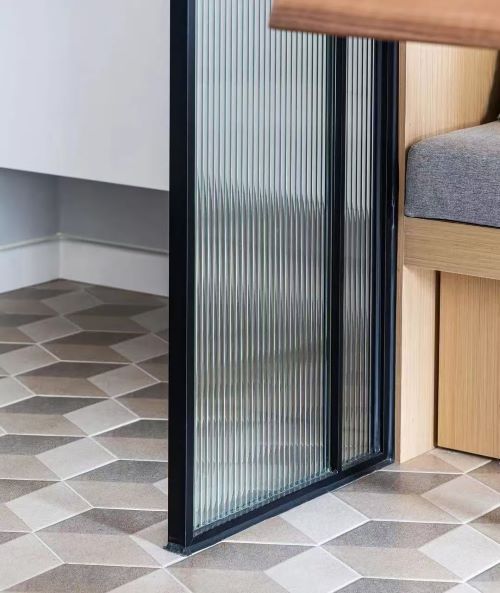 长虹玻璃隔断,质感轻盈避免了传统隔断的视觉突兀,起到半遮挡的作用,又能保持空间通透性。地面采用地砖与地板拼接设计,浅色调弱化空间区隔,又增加空间趣味性。