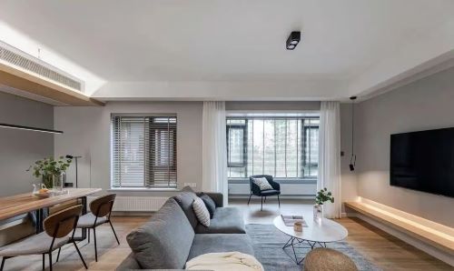 成都装修案例分享:110㎡户型,灰白原木为主调,打造出既通透又高级的居住空间!关于成都装修装饰业务事宜可以联系18908074871微信同号。