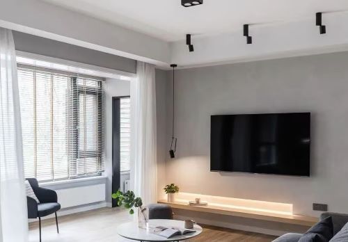 电视墙没有多余的造型设计,简洁明了不做作,灰色为主调内敛雅致,搭配一抹暖黄的灯带,带出空间温馨氛围。没有厚重的电视柜,以木质隔板架取代,简易实用日常打理也省事。