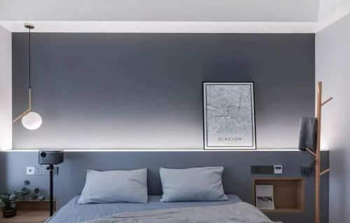主卧简洁有格调,以优雅的雾霾蓝为背景色,搭配隐藏灯带设计,打造沉浸式睡眠空间。舍弃传统式床头柜对称格局,以悬空置物台面和壁龛置物框架,解决床头收纳需求。
