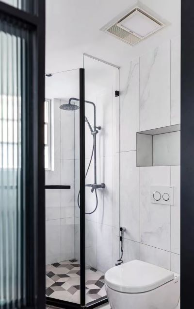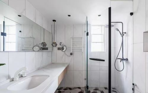 主卫设计以舒适实用性为目的,壁挂式马桶和悬挂洗漱台,让清洁工作更轻松高效。白色纹理墙砖围塑简洁明快空间,搭配六边形地砖,增添一抹浪漫气息。