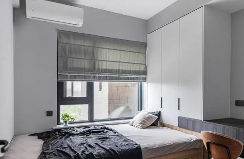次卧由于空间有限,采用定制家具提高空间利用率。榻榻米飘窗床可睡、可休闲娱乐、可收纳,一举多得。长型壁柜强化收纳,同时延伸出悬挂书桌,让视觉效果更统一。