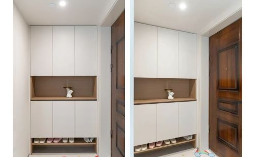 将鞋柜嵌入墙体,采用白色柜门+原木色柜体的设计,既能保持视觉干净利落,又能增添自然温馨感。、