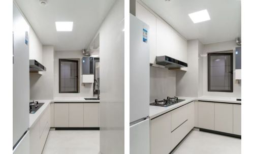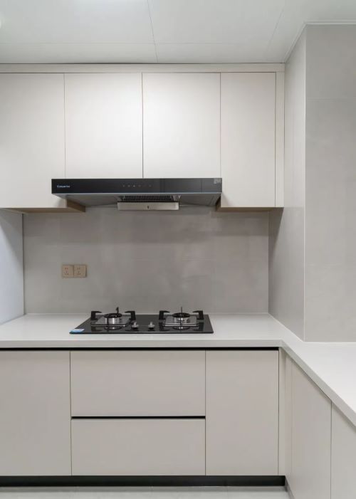 厨房以白色为主,搭配浅木色或浅灰色点缀,营造明亮、干净的视觉感。采用L型布局,优化“洗-切-炒”动线,提高操作效率。