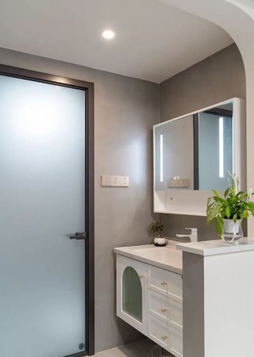 过道分离洗漱区,利用半墙设计透光不压抑。墙面和地面铺贴灰色哑光砖,搭配纯白浴室柜,打造极简美学。