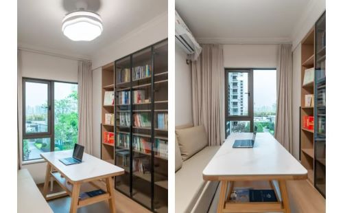 8㎡的极简书房,居中原木书桌分隔两侧,一侧黑玻书柜藏露有序展示藏书,一侧折叠沙发床兼顾客卧功能,小空间实现高效办公与灵活休憩。