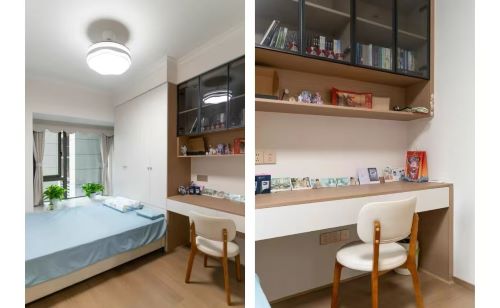 次卧采用榻榻米+连体式衣柜书柜书桌组合,L型布局无缝衔接,纯白柜门搭配原木台面,既满足储物收纳、学习办公,又保留1.5米标准睡卧功能,小空间实现三位一体多功能。