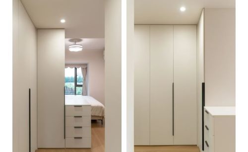 主卧进门将隔断+收纳一体化,转角衣柜连接矮柜,既分隔空间,又增加收纳。木地板通铺+大白墙,营造治愈系浅色睡眠空间。