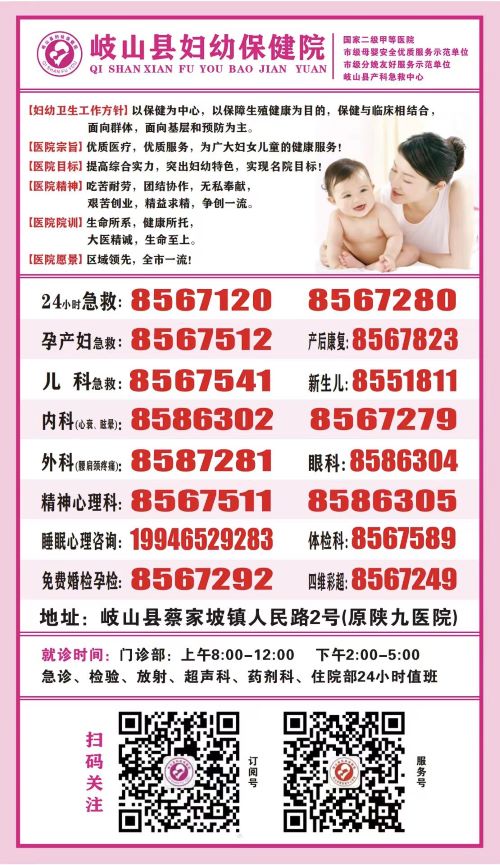 岐山县妇幼保健院24小时急救电话:8567280 8567120,岐山县妇幼保健院孕产妇急救电话:8567512,岐山县妇幼保健院儿童急救电话:8567541,岐山县妇幼保健院总值班电话:8552160