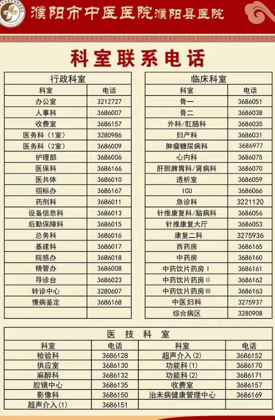 说明:关于濮阳县中医医院各医疗业务科室联系电话的信息仅供参考。