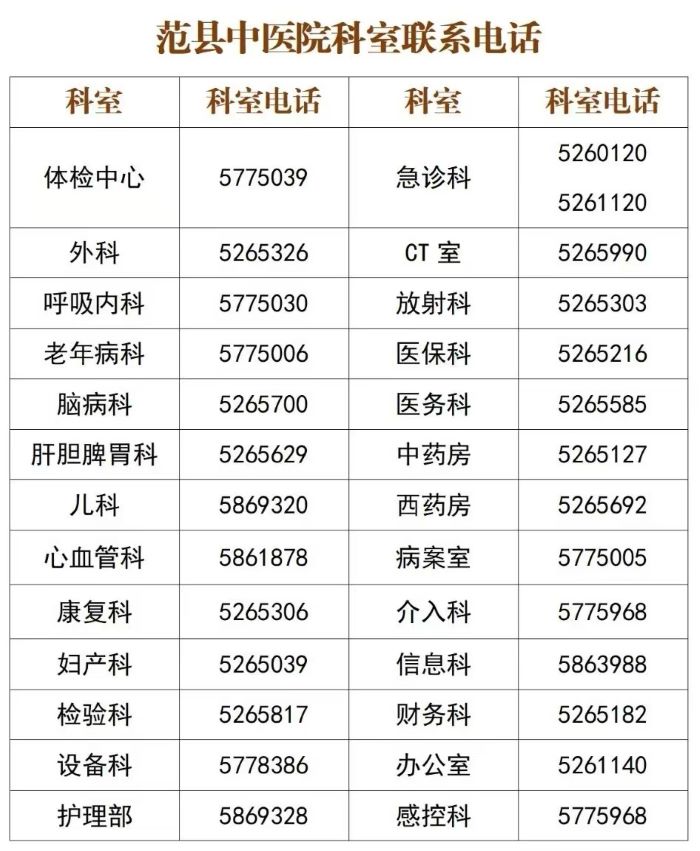 范县中医医院各医疗科室联系电话表如下: