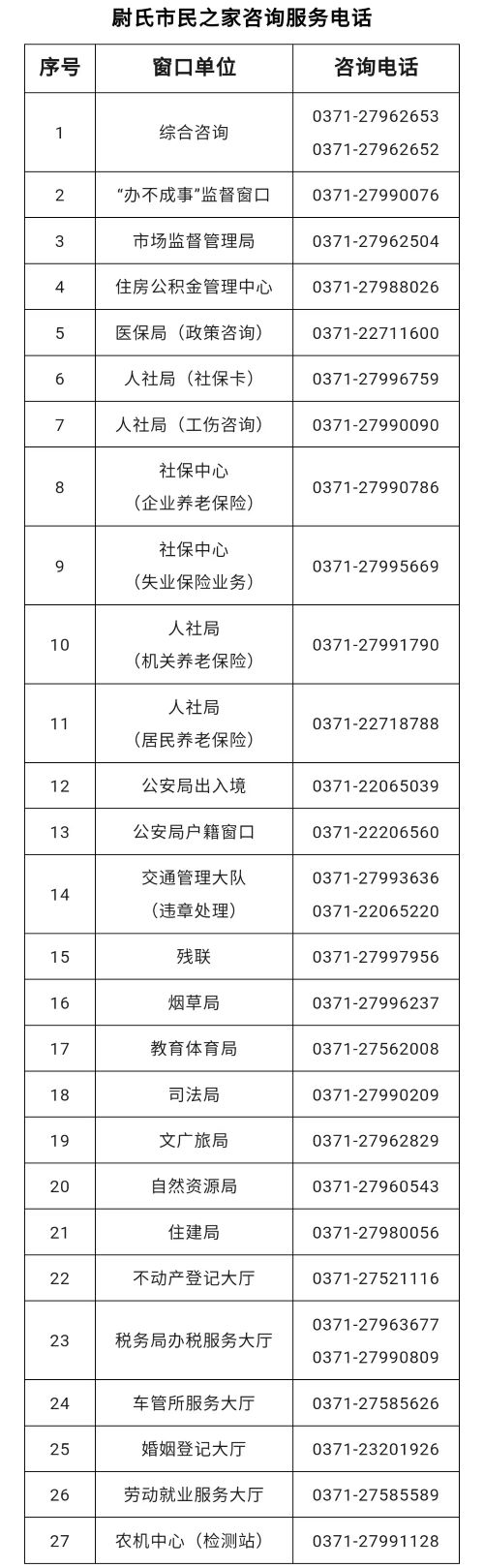 说明:关于尉氏县市民之家进驻单位窗口咨询服务电话表的信息仅供参考。