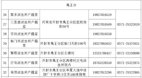 开封市禹王台区范围内各派出所户籍室地址和业务电话: