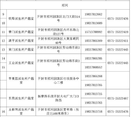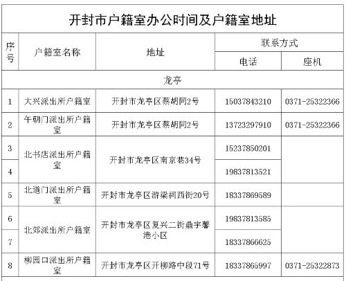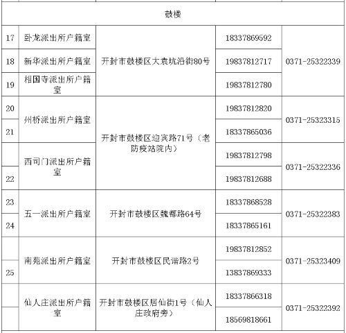 开封市户政热线(各区、县辖区基层派出所户籍室地址和电话)信息大全