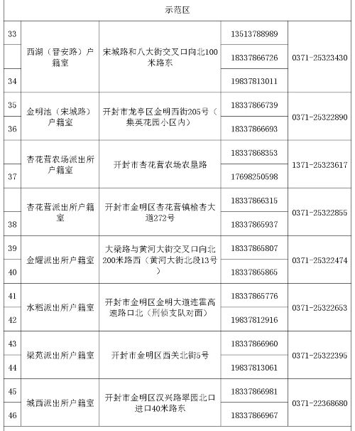 开封市示范区各辖区基层派出所户籍室地址和电话信息大全