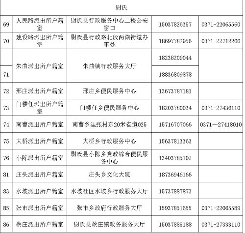 开封市尉氏县各辖区基层派出所户籍室地址和电话信息大全