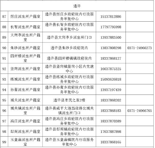 开封市通许县各辖区基层派出所户籍室地址和电话信息大全