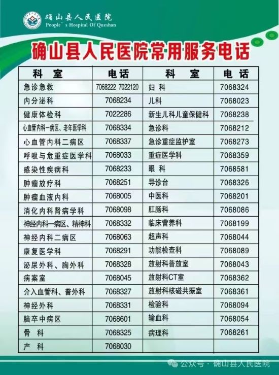 说明:关于确山县人民医院科室常用服务电话表的信息仅供参考。