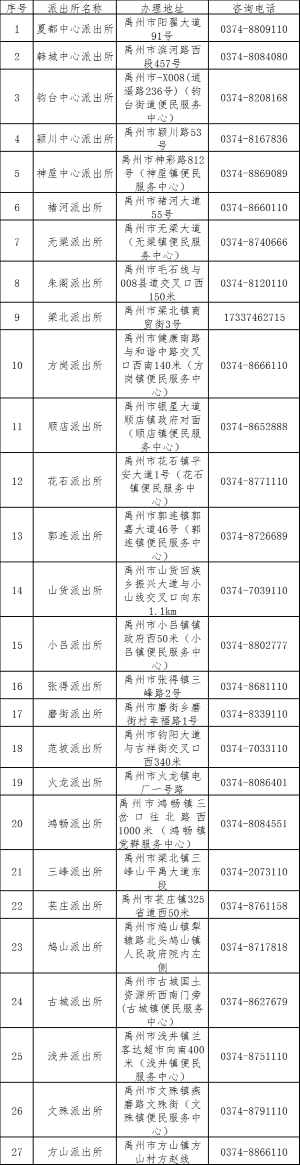 户政便民黄页:禹州市各辖区派出所户籍窗口身份证等办证窗口咨询电话。